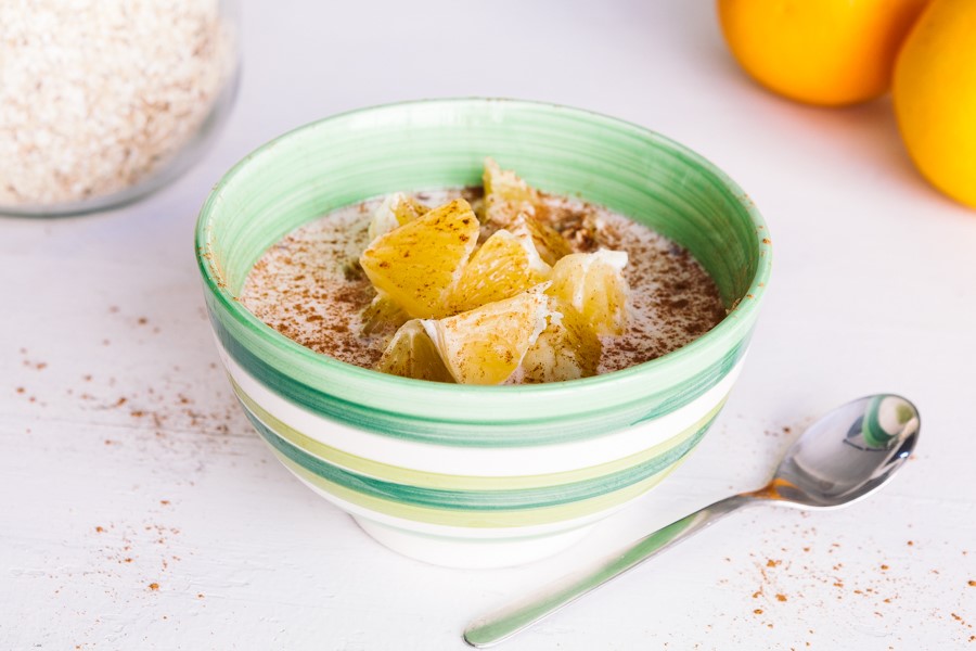 Enquanto isso, descasque e corte a laranja em cubos. Sirva por cima da aveia molhada.
