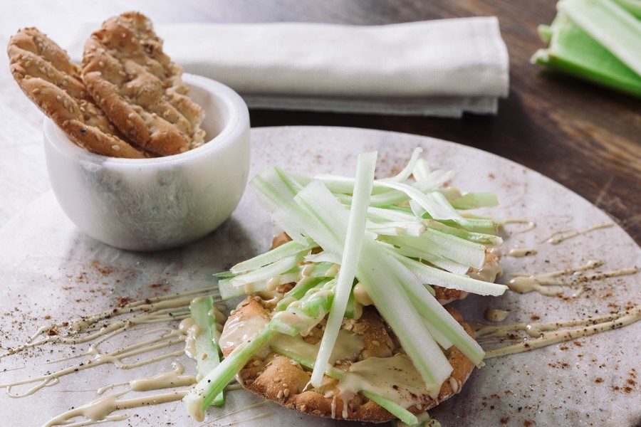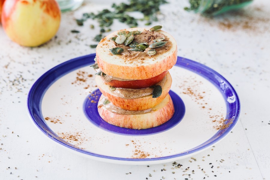 Espalhe AKA’YU na fatia de maçã e polvilhe com sementes de abóbora e canela.